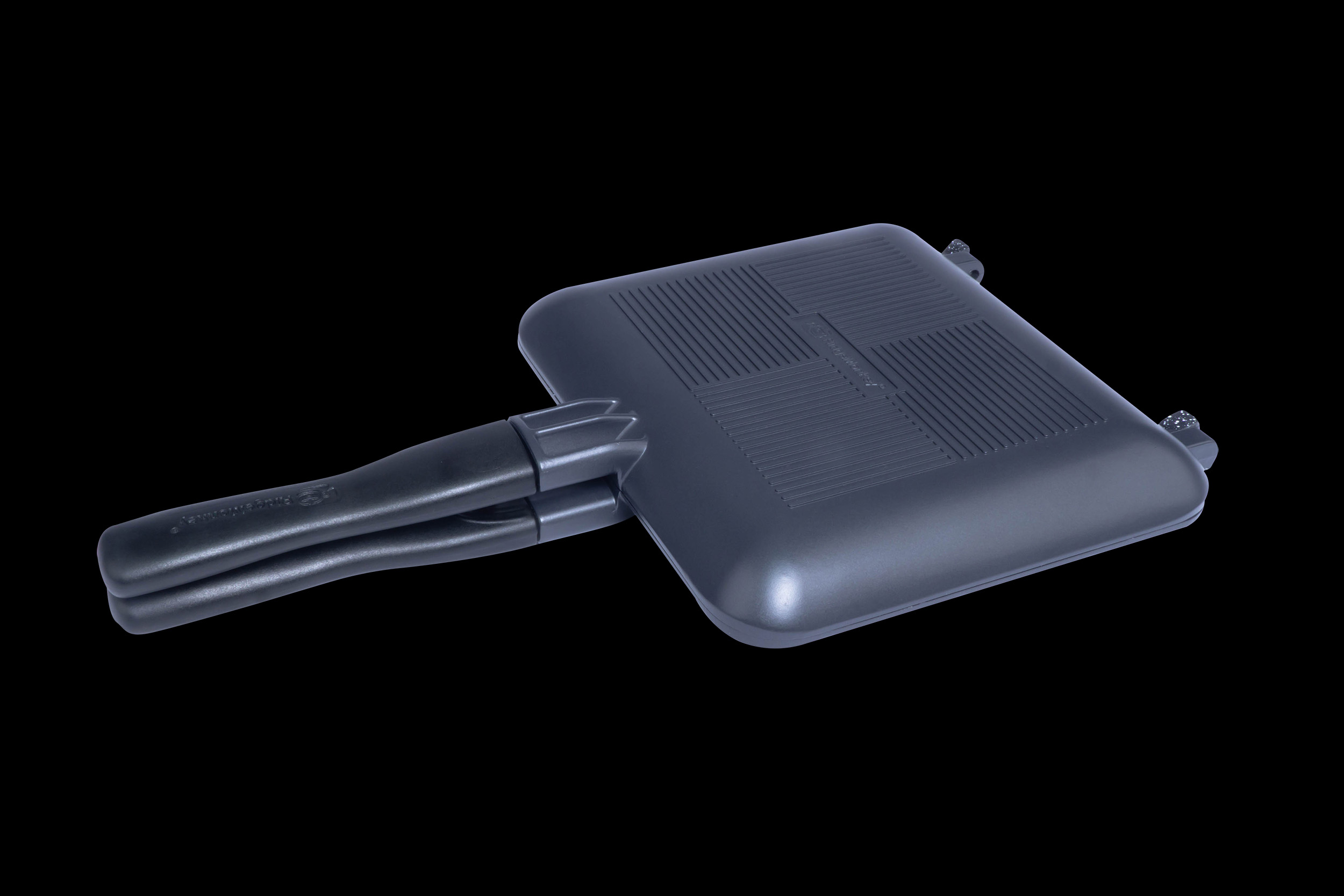 Der RidgeMonkey Connect Sandwichtoaster XL Granite Edition verfügt über abnehmbare Cool-Touch-Griffe, ein abnehmbares Scharniersystem, das eine Pfanne in zwei verwandelt, und ein komplettes Utensilienset, das zusammen mit den Griffen in den Toaster passt, um es einfach zu verstauen. Die quadratische Form bedeutet auch, dass weniger Stauraum verschwendet wird als bei herkömmlichem kreisförmigem Kochgeschirr.