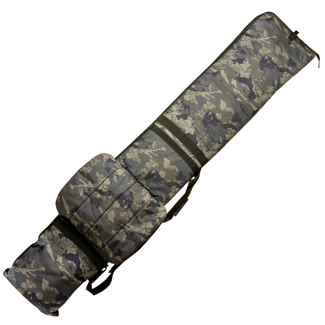 Aus 600D getarntem PU-beschichtetem Material mit Rundum-Polsterung bietet diese Reisetasche Platz für 3 konfektionierte Ruten innen und 2 konfektionierte Ruten außen. An der Außenseite dieser Reisetasche können sowohl nackte Ruten als auch Einzelrutenhüllen angebracht werden.