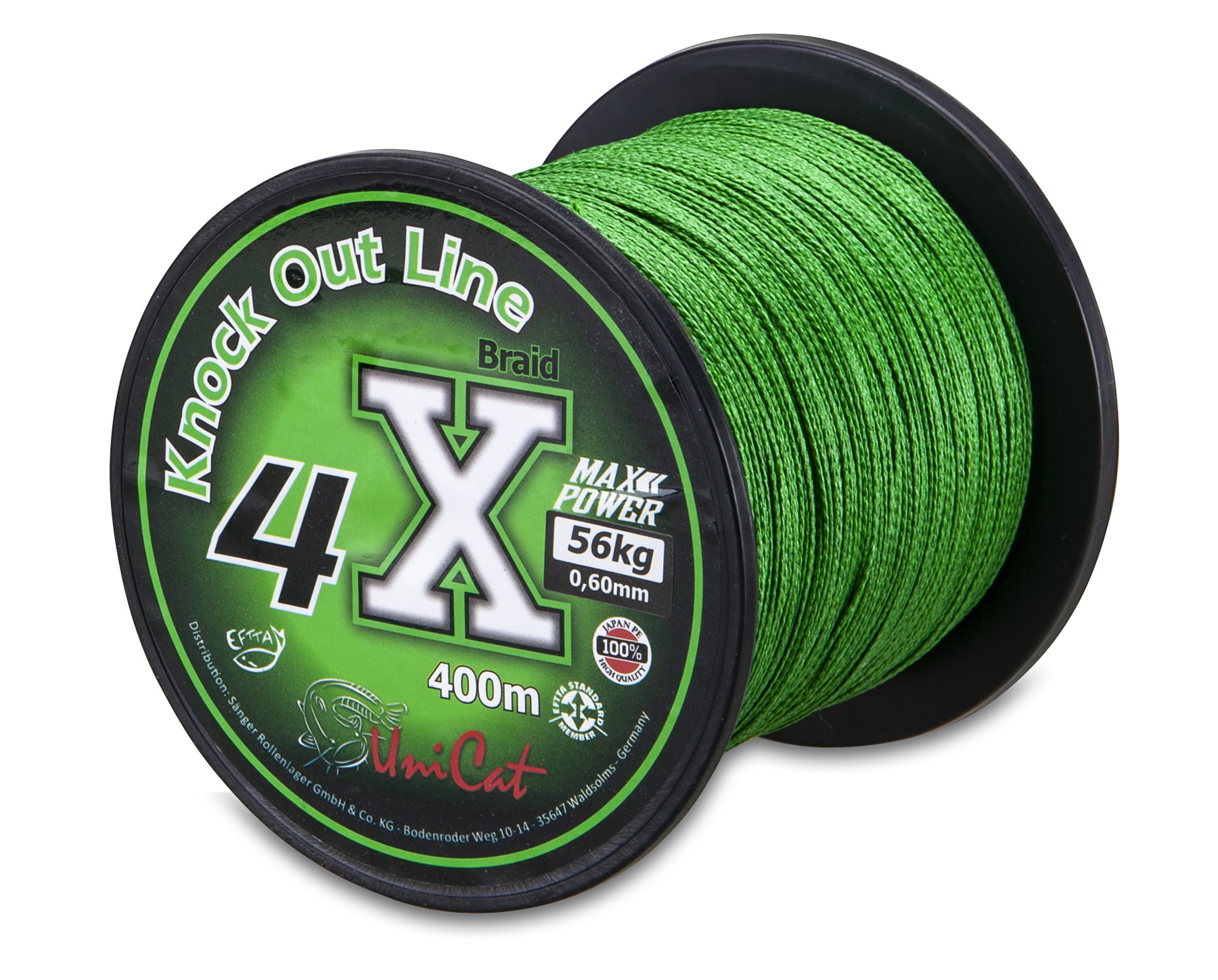 In Punkto Tragkraft und Abriebfestigkeit punktet die neue Knock Out Line wie keine andere. So hat schon die 0,40 mm einen fast unvorstellbare, aber tatsächlich nachweisbare Tragkraft von 32 kg. Bevor Sie die Produktionsstätte verlässt wird die Knockoutline einem Computergesteuerten Prüfverfahren unterzogen und anschließend vom Qualitätsmanagement abgesegnet. Durch die enge Flechtung wird vermieden, dass die Schnur Wasser aufnehmen kann und ermöglicht Ihnen gleichzeitig weite Würfe, gerade beim Spinnfischen auf Waller. Auch beim Distanzfischen mit der Boje glänzt Sie durch Ihre absoluten Spitzenwerte. Mit Hilfe der auffällig, fluoreszierende Farbe der Schnur , wissen Sie auch bei widrigen Sichtverhältnissen, wo sich ihr Köder gerade befindet. • 4-fach geflochtenes Hochleistungs PE-Braid